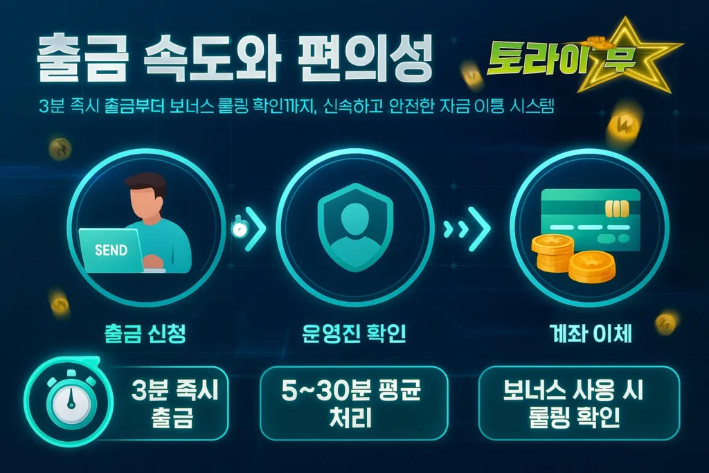 | 출금 속도 | 5~30분 이내 신속한 출금 처리 | 출금 지연, 핑계 및 조건 추가, 미지급 |