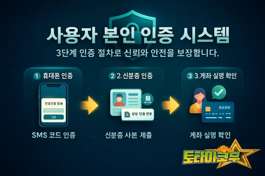 3단계 인증은 계좌 실명 확인으로, 출금 계좌가 본인 명의인지 확인합니다. 일부 사이트는 소액을 먼저 입금하게 한 후 입금자명을 확인하는 방식을 사용하기도 합니다.